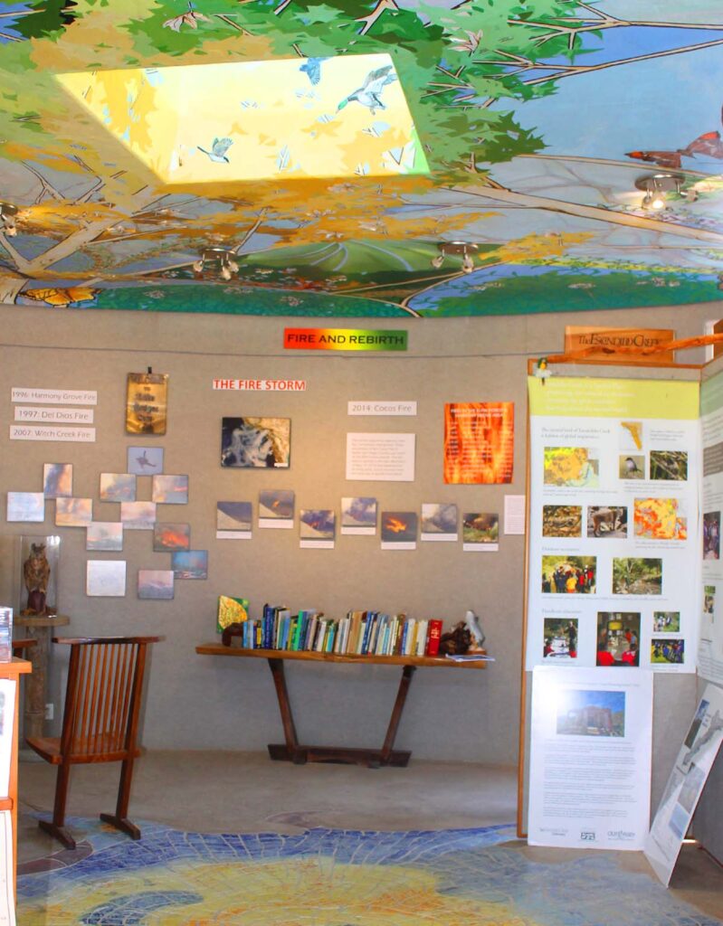 The interpretive center contains many permanent artistic components, including several original works by James Hubbell and his collaborations with other artists. The building also features green design elements such as recycled building materials, solar panels powered by photovoltaic cells, and a green “living” roof.