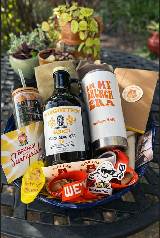 - Broken Yoke Café gift basket which includes a $50 gift card, tote, water bottle, keychain, glass cup with lid, stickers, t-shirt, lanyard