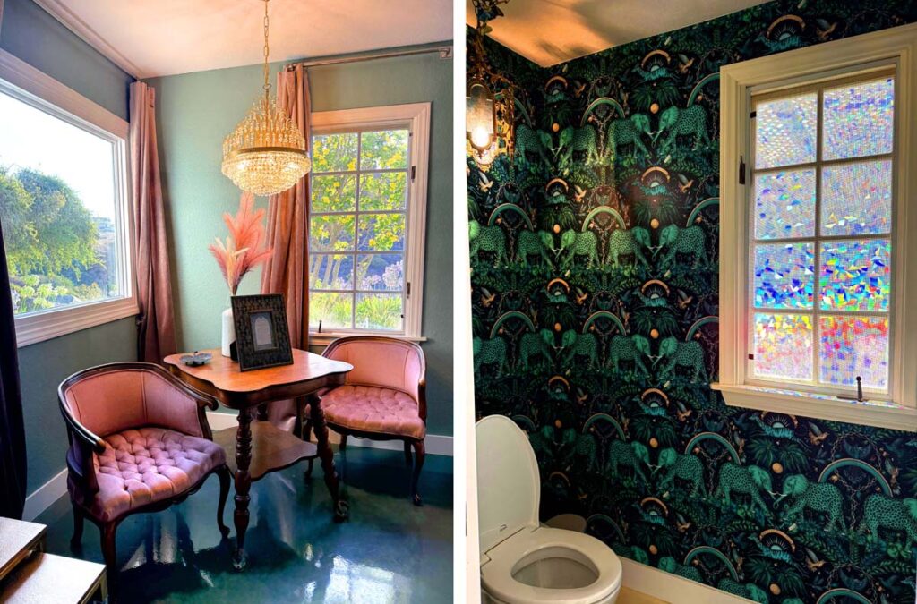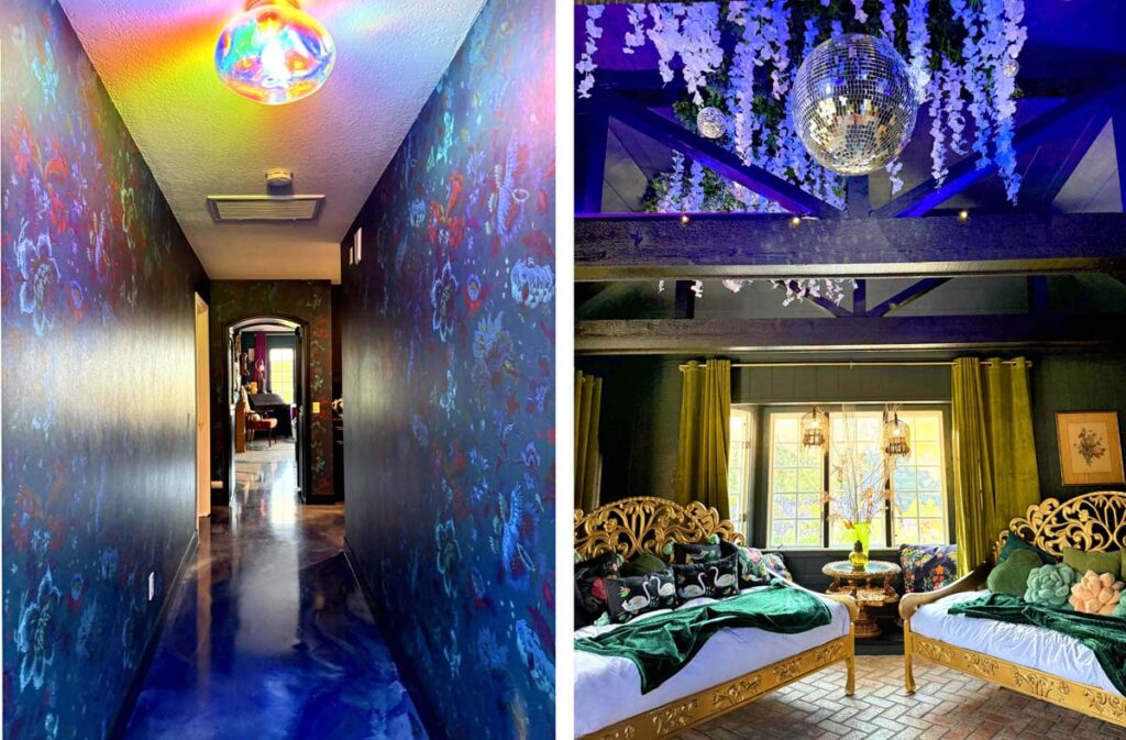 The Jade Dream Room soothes the senses with two plush king beds wrapped in calming jade tones, while the Disco Sun Room offers three bohemian twin beds where moody botanicals meet shimmering disco magic.